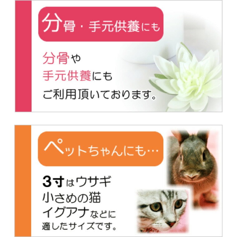画像内の骨壷サイズ(3寸):直径約9cm×高さ約11cm ・・・ サイズの目安にしてくださいませ。