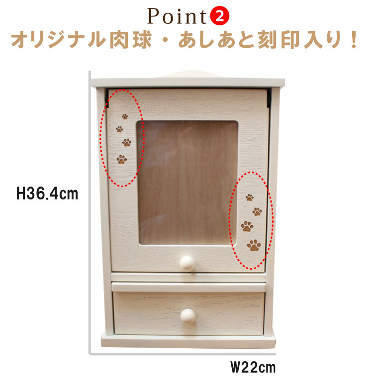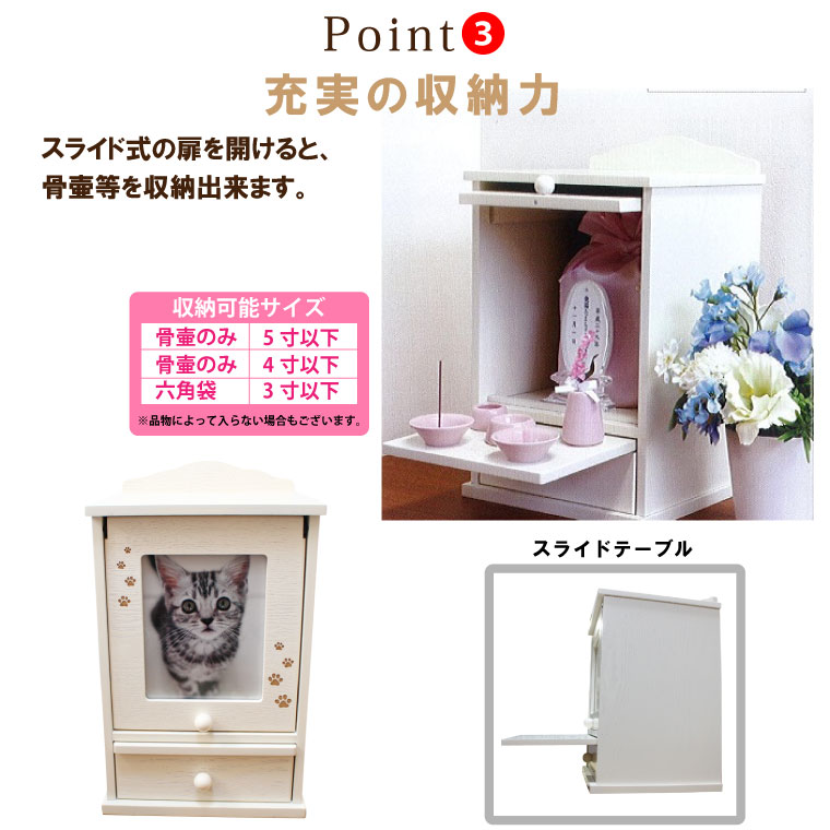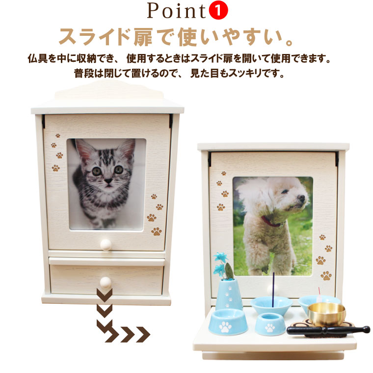 ペット 仏壇 メモリアルハウス 肉球刻印入り スライド扉 ホワイト 5寸までの骨壷収納可能 2L写真入れ