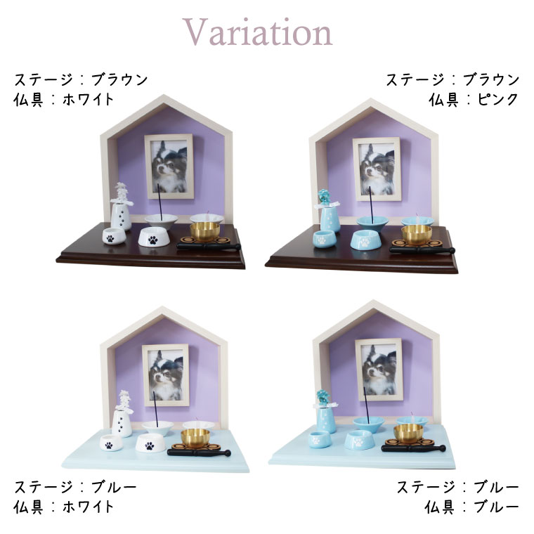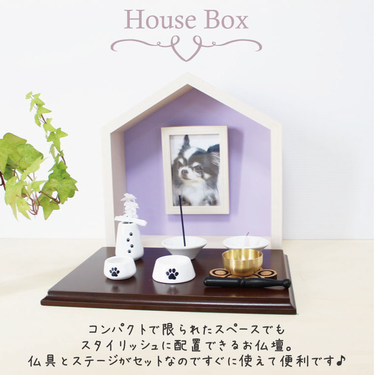 ペット仏壇 メモリアルフォトフレーム ペットのおうち型 ハウスBOX ナチュラル×パープル メモリアルハウス L判 仏具8点肉球刻印セット 肉球おりんセットコンパクト