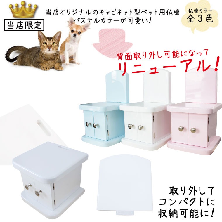 可愛いパステルカラーの木製キャビネット型のペット仏壇。背面が取り外しになってリニューアル。