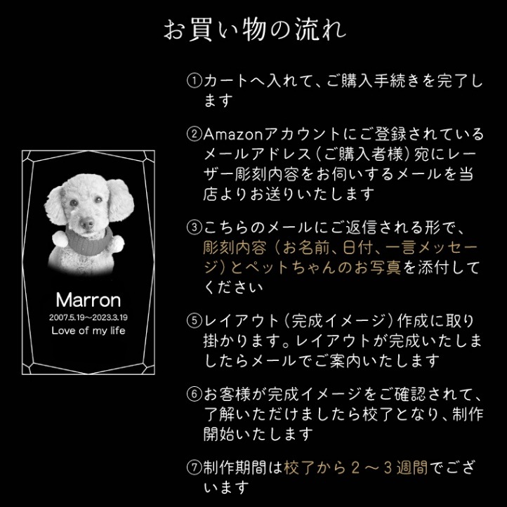 画像・お名前・生誕日~没日・メッセージ(メッセージは10文字位2行まで)をメール又は郵送にてお願い致します。